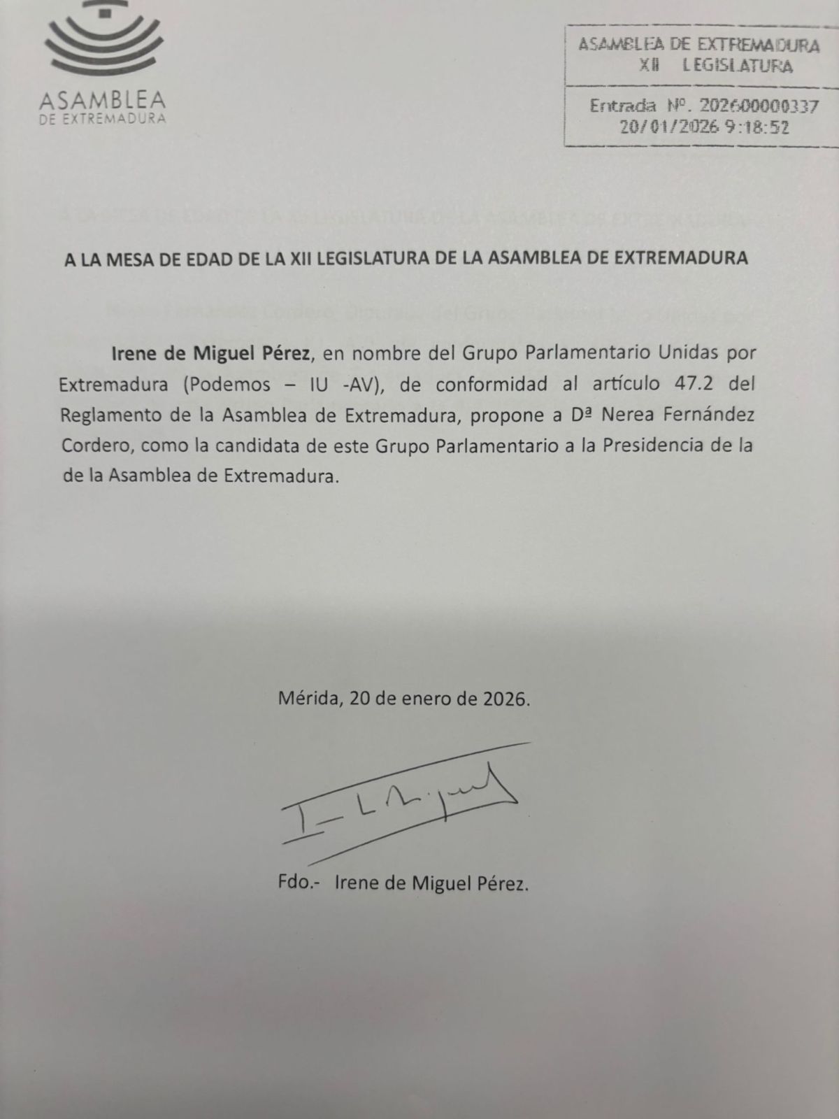 Unidas por Extremadura registró este martes sus propios candidatos a los puestos de la Asamblea regional, que se constituye a partir de las 10.00 horas, confirmando así que no apoyará a los del PSOE.