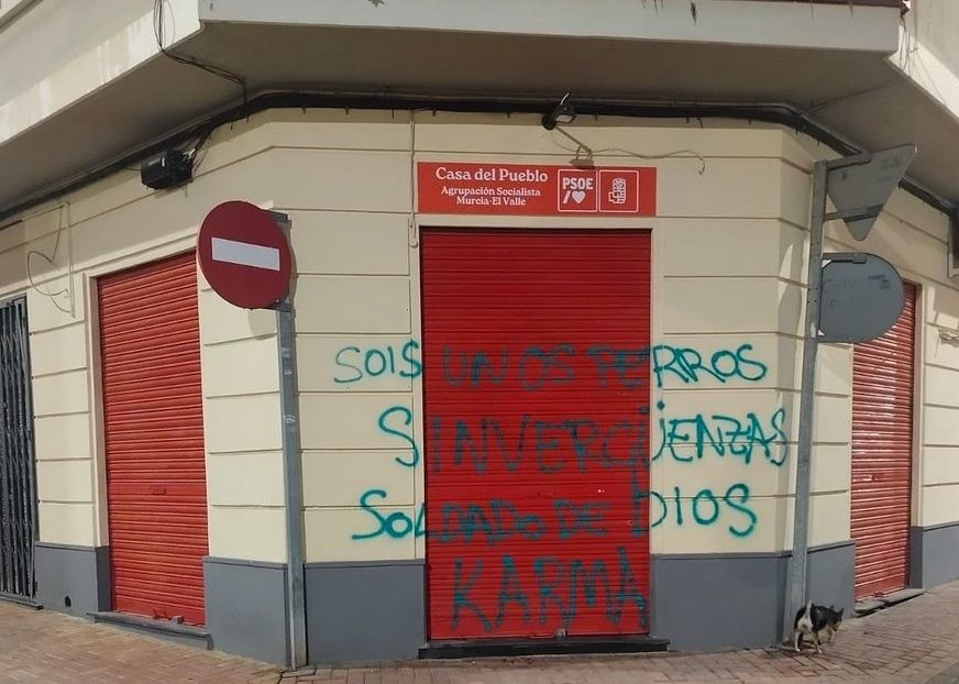 La Casa del Pueblo de Murcia El Valle amaneció este viernes vandalizada con pintadas en la puerta y la formación pidió al PP que se solidarice y condene estos hechos como hace el PSOE frente a cualquier acto violento.