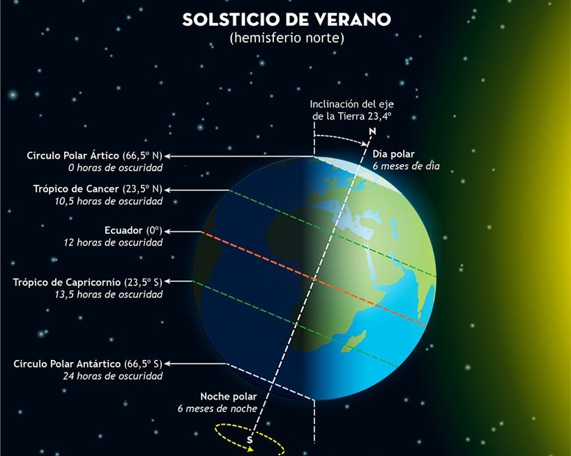 El comienzo del verano en el hemisferio norte está definido por el instante en que la Tierra pasa por el punto de su órbita desde el cual el Sol presenta su máxima declinación norte. El día en que esto sucede, el astro rey alcanza su mayor elevación sobre el horizonte al mediodía y describe en el cielo el arco más largo. Como resultado, se trata del día más soleado del año.